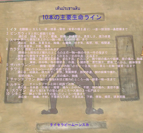 タイの伝統医学の原則によれば、私たちの体は多くの線や靭帯、または腱で構成されています。そして、循環器系には重要な、タイの伝統医学の主要なラインである10のラインと3つの特別なラインがあります。おへその周りに出発点があり、体のさまざまな部分に分けられます。そのエネルギーライン、エネルギーポイントを見つけて、セラピーマッサージを行い、症状を緩和する方法を学びます。